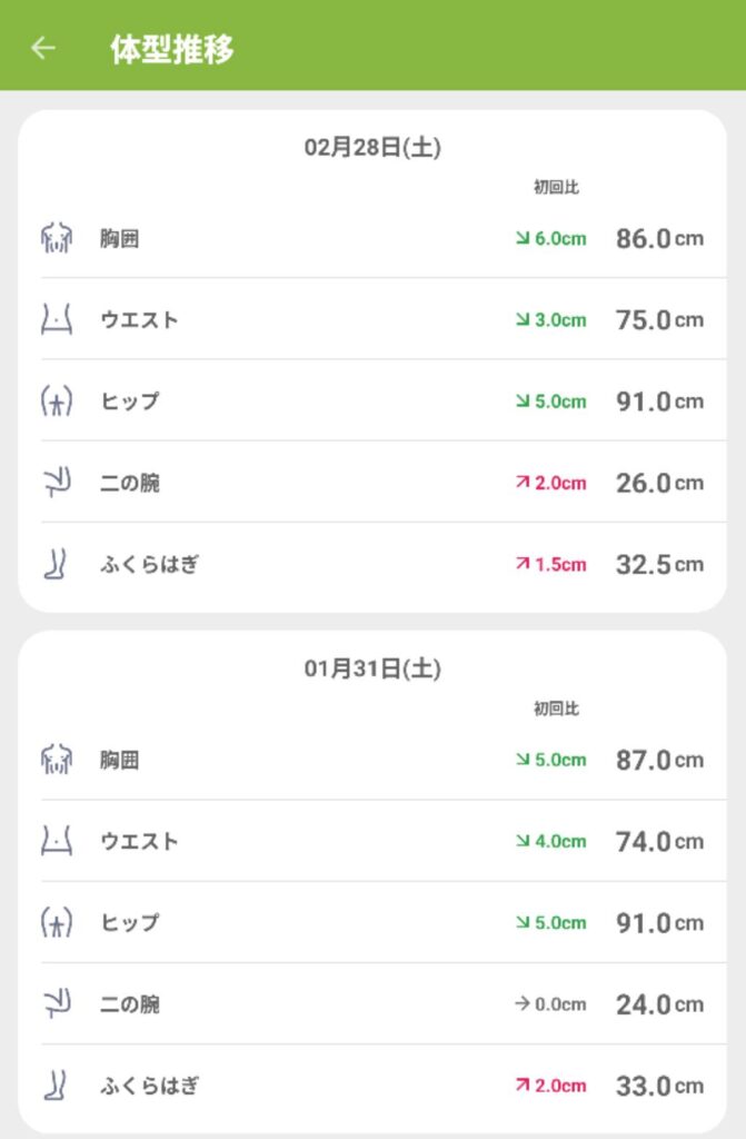 1月に比べると胸囲は1センチ減少してるけど、そのほかは1センチ増加していたりそのままだったりしていますね